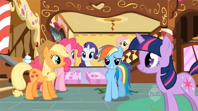 In Rainbow Dash, die Retterin ist Rainbow Dash ihr Heldenruhm zu Kopf gestiegen und sie hält hält ein Fantreffen im Nascheckchen ab. Später diskutieren die Mane 6 hier über die gute Stute die Rainbow den Rang als Heldin abgelaufen hat.