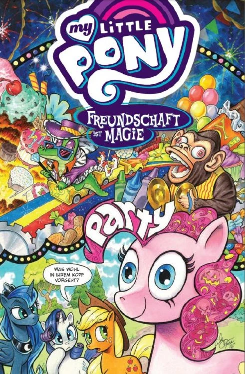 Zur selben Zeit werden in Ponyville die Ponys mit explodierenden Geschenken malträtiert und suchen Schutz im Stadttheater. Wo Pinkie sie zwingt sich ihre miese Show anzusehen. Es gibt kein Entrinnen da zum einen alle Türen verriegelt sind zum anderen die Sitze mit Klebstoff bestrichen wurden.