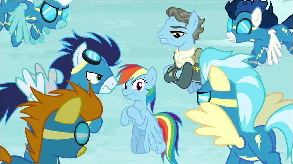 Esto causa confusión entre los Wonderbolts hasta que Wind Rider sugiere que alguien le envió a Spitfire una nota falsa para sacarla de la presentación, causando que toda sospecha caiga sobre Rainbow Dash. Aunque Rainbow está abierta acerca de su deseo de volar con Wind Rider, ella se declara inocente. Después de una breve discusión, Soarin le da Rainbow la oportunidad de demostrar su inocencia, pero si no puede, ella será expulsada de los Wonderbolts.