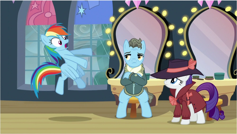 En una parodia en blanco y negro del cine negro de 1940, Rarity y Rainbow Dash inspeccionan la suite del castillo de Spitfire. Rarity descubre un pedazo de la melena de Rainbow en el sobre donde la nota fue enviada, y ella