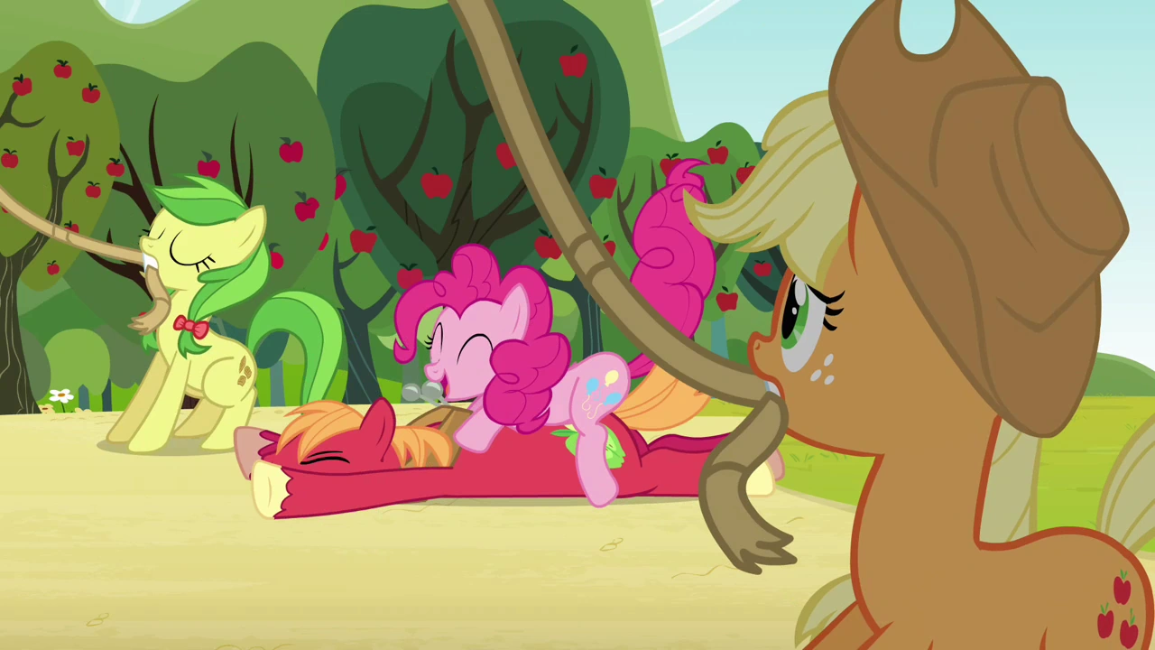 También se ve en Demasiadas Pinkie Pies , una de ellas se le echa encima cuando levantaba el granero con su familia, y él suelta la cuerda de la que tiraba, haciendo que el resto de ponis no puedan con el peso.