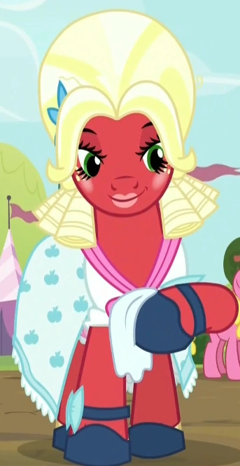 arnés para el arado, incluyendo cuando es joven en Crónicas de la Amistad. Normalmente tiene una ramita de trigo en la boca. Él y Applejack, tienen unas «pecas» muy parecidas en sus mejillas. Durante su primera aparición, su Cutie Mark tiene unos destellos alrededor de la manzana que no están presentes en las siguientes apariciones, pero vuelven en La Hermandad de los Cascos.