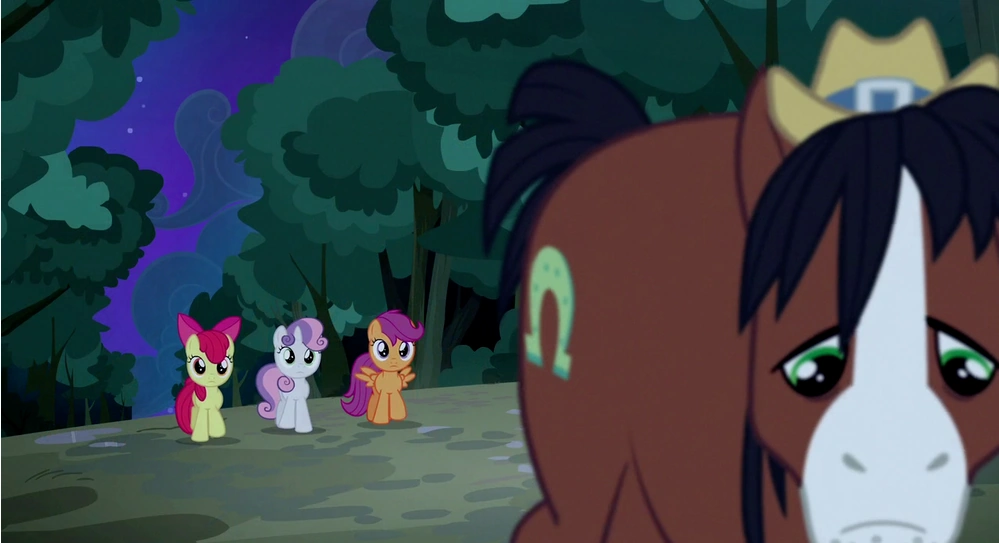 Mientras tanto, Apple Bloom, Sweetie Belle y Scootaloo todavía perdidas en el bosque, hallan una cabaña aparentemente abandonada y la utilizan para refugiarse de la lluvia torrencial. De pronto, ellas se encuentran sobre una sombra grande. Gritan en el miedo, asustando a la figura que torpemente golpea las cosas y se cae. Las Crusaders aspiran al atacante que resulta ser un corcel alto aún sin pretensiones.