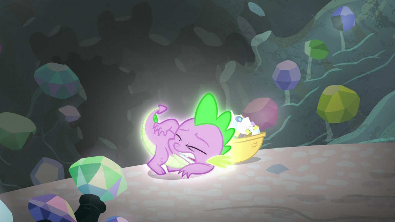 El episodio comienza con la minería de gemas de Rarity en una caverna subterránea, con Spike sirviendo como su sostenedor de cesta de gemas y "guardaespaldas". Rarity desea recoger gemas sin despertar a una colonia de murciélagos durmiendo. Por desgracia, Spike comienza inesperadamente a brillar, para gran temor de Rarity. Mientras se rasca sin control, los murciélagos despiertan y enjambran sobre él y Rarity.