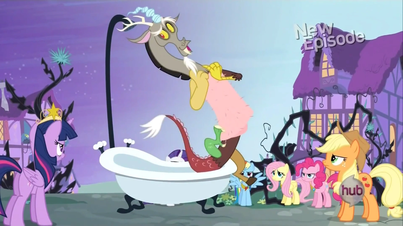 Las amigas se dirigen a un lugar despejado afuera, se ponen de pie en un círculo y usan los Elementos de la Armonía para convocar a Discord, que está tomando una ducha y cantando Envolviendo el Invierno. Discord no está molesto en lo más mínimo, pero le hace recordar a Twilight que Celestia le había dicho que ella le avise antes de una convocatoria. Twilight exige que libere inmediatamente a Celestia y Luna y detenga la invasión del Bosque Everfree. Discord niega causar el caos y afirma ser reformado.