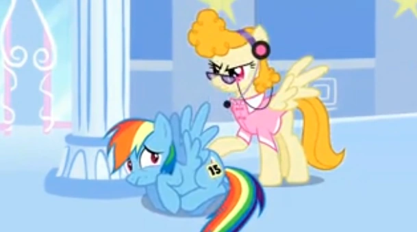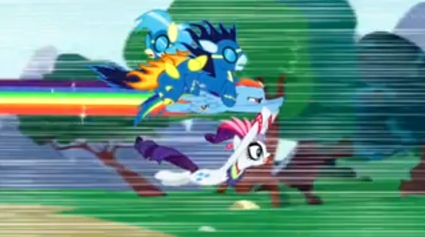 Mientras Rarity comienza a bailar por la arena, Rainbow tropieza con las dos primeras fases de su rutina antes de ascender para prepararse para el rain-ploción sónica. Rarity vuela por encima del público para proyectar la luz del sol a través de sus alas, pero la exposición al calor hace que se evaporen, lo que provoca que caiga en picada hacia el suelo. Los Wonderbolts intentan rescatarla de inmediato, pero quedan inconscientes al ser golpeados por sus extremidades mientras se agita. Al oír los gritos de Rarity, Rainbow se lanza en picado para salvarlos, generando un rain-plosión sónica en el proceso. Los alcanza justo antes de toquen el suelo y los lleva de regreso al Cloudeseum mientras la multitud estrella en vítores.
