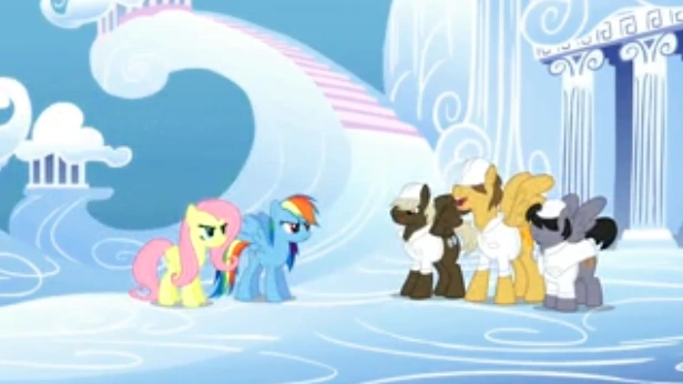 Fluttershy y Rainbow llegan a Cloudsdale y se topan con tres rivales de la infancia que niegan que Rainbow sea capaz de realizar un rain-ploción sónica. Mientras Fluttershy intenta tranquilizarla, el resto de las Mane Six llega en un globo aerostático y desembarca en forma segura gracias a un hechizo que les permite caminar sobre las nubes como los Pegasos, ya que el hechizo para las alas de Rarity resultó demasiado difícil de realizar más de una vez. Animada por la llegada de sus amigas, Rainbow decide llevarlas a dar un recorrido por la fábrica de clima de Cloudsdale.