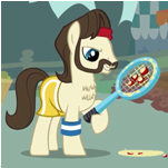 Apple Bloom usa su raqueta en Llamada de la Chica. Según el director de arte Ridd Sorensen, quien lo diseñó, es el cuarto mejor tenista de Equestria. Aparece con su habitual atuendo en Luna Eclipsada. Su Cutie Mark no es visible, pero Sorensen escribió que es una pelota de tenis. |