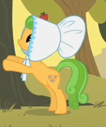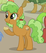 Miembro de la familia Apple presente en la reunión en La Magia de la Amistad, Parte 1. Aparece como poni de fondo en Duelo de Magia. Su Cutie Mark son tres manzanas mordidas. |