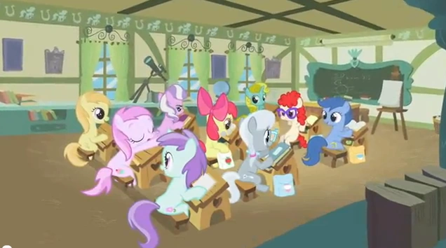 Cuando Diamond Tiara y Silver Spoon empiezan a burlarse de Apple Bloom frente a todos, Scootaloo y Sweetie Belle salen de debajo de una mesa para defenderla, revelando que ellas también tienen los costados en blanco y argumentando que eso representa potencial, no la falta de cualidades especiales: