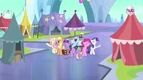 Pinkie y algunos potrillos dando dulces a la estuatua