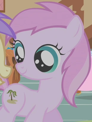 Tiene la crin de color rosa medio, al igual que la cola, con ojos turquesa, y una Cutie Mark de una palmera igual a la de Coconut. E incluso a veces sale sin Cutie Mark. Junto a la Princesa Luna y el Rey Sombra, su nombre está en español.