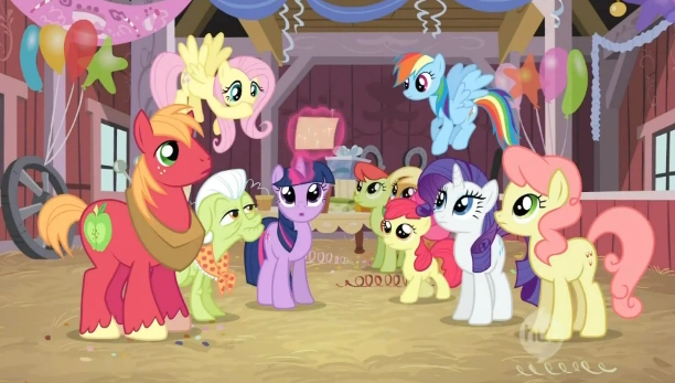 Pink Lady escuchando la carta de Applejack leida por Twilight