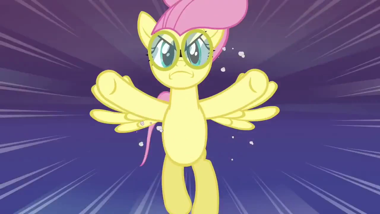 Fluttershy s'entraîne dur pour reprendre confiance en elle et montrer aux autres pégases qu'elle vole très bien.