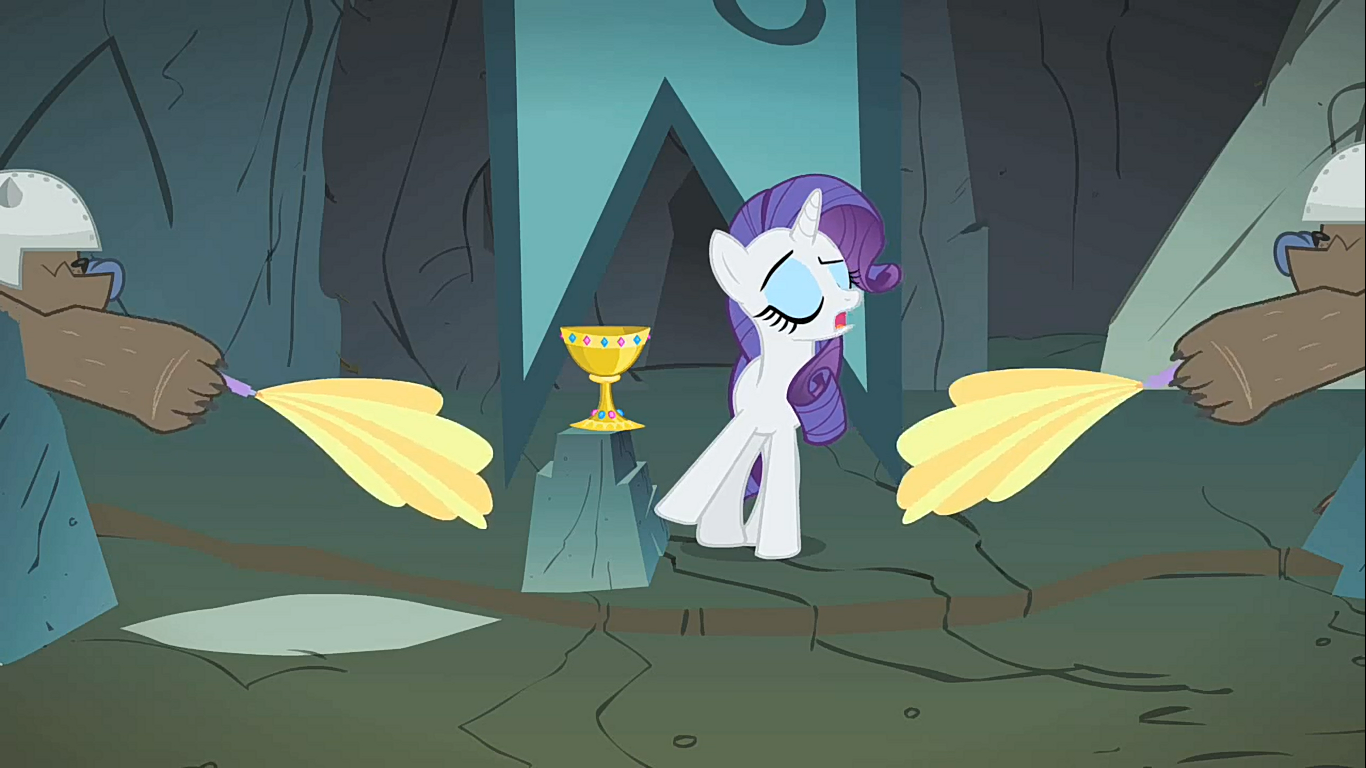 トンネルの地下の奥深くの中央部で、Diamond dogsはRarityに見つけられる宝石すべてを探し当てろ、と言った。早速彼女は宝石を見つけ、彼らに掘るよう言うと、掘ることも自分でしろと返される。仕方なく彼女は掘るものの、あまりに遅い上にまるで蹄で掘ることを嫌そうにした仕草で掘っている。 その遅さに我慢ならず、Diamond dogsのリーダーは衛兵に宝石を掘らせて、代わりに彼女を宝石をいれるカゴを引かせることにした。しかしここでRarityは不満や愚痴やかましく言い始める。それに耐えかねてDiamond dogsは何でもするから黙ってくれと彼女に言った。すると立場は一変、Rarityが宝石を探し当てて、犬らが掘っていた時と変わって、Rarityはまるでお姫様の様な扱いを受けることとなった。Diamond dogsの内の一匹が、立場が逆ではないかと気づき、とにかく愚痴でも何でも言わせて働せればいいとRarityに再び宝石のカゴを引かせようとした。しかし彼が彼女のことをラバと罵った直後に彼女は泣き崩れてしまった。彼らは彼女をなだめようとするものの、Rarityは一向に泣きやまなかった。その泣き声が助けに来たポニーたちに聞こえ、その音がした方に進んでいくと、Rarityの声がする扉を見つけた。しかし、突然犬の衛兵たちがポニーたちにのしかかり、丁度いい働き馬が手に入った、とハーネスを縛り付けた。そこでポニー達はとにかく跳ねて暴れ回ることで、犬たちを振り落とした。犬の衛兵たちを追い払った後に、Spikeは天井に伸びていた鍾乳石を折って槍の様にし、トワイライトにまたがった。Rarityをついに見つけたものの、彼女がDiamond dogsをやりこめて言いなりにさせていた後であった。結局、彼らは見つけた全部の宝石とRarityを引き取ってくれとポニー達に頼み込んだのであった。