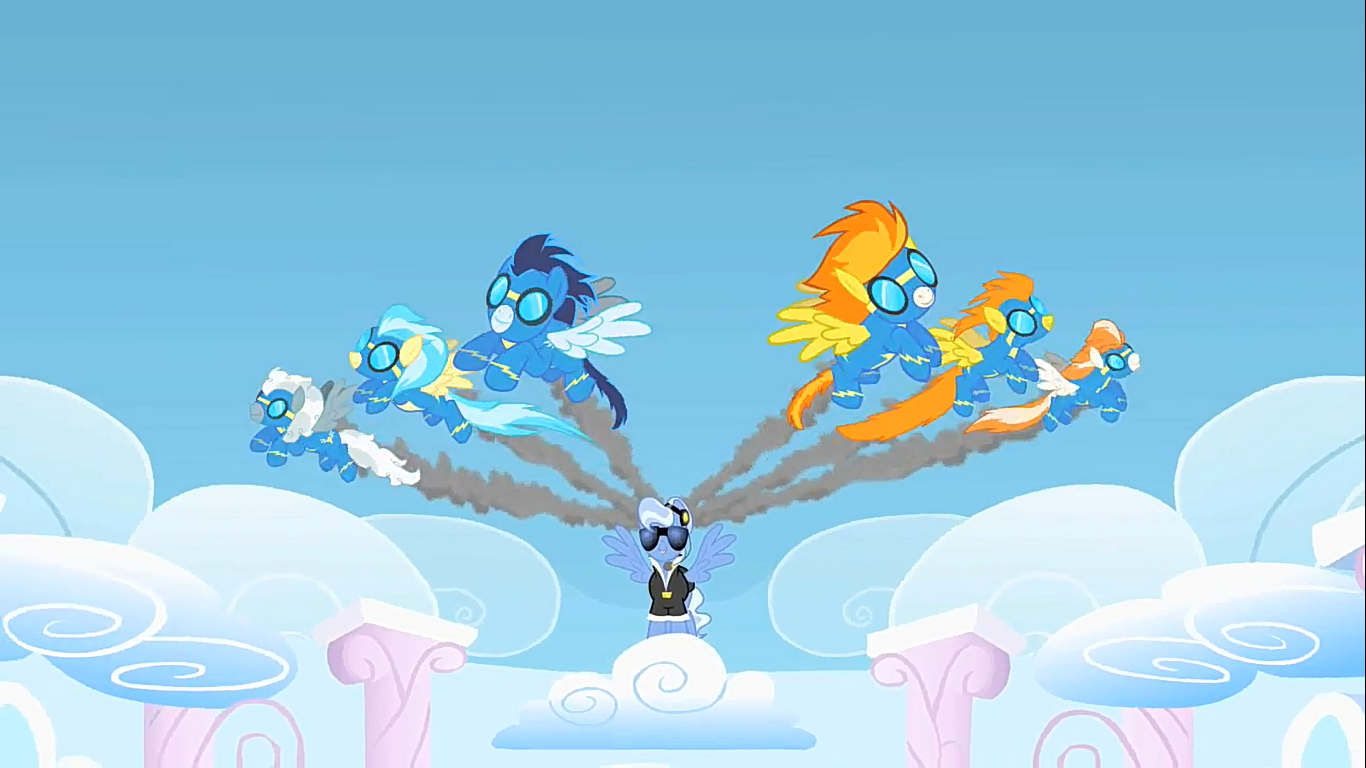 Princess CelestiaはWonderboltsと共に、コンテストの特別な審判として出席した。不安に圧倒されたRainbow Dashは、ナンバーカードを張り替えることで順番を遅らせた。一方Rarityは、出場に向けての準備に忙しかった。Rarityの出番が来た時は、準備がまだできてないとスタッフに伝え、他のペガサス達に順番を譲った。観戦するTwilight達はペガサス達のパフォーマンスに感動していたが、それでもRainbow DashとRarityの出番を楽しみにしていた。参加者の順番は以下のとおりである。