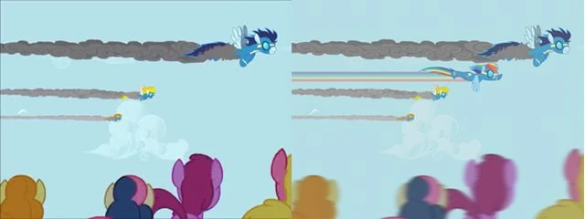Rainbow DashがTwilight Sparkleに理想を語るシーン。Teacher For A Day(左)と、上映版(右)。