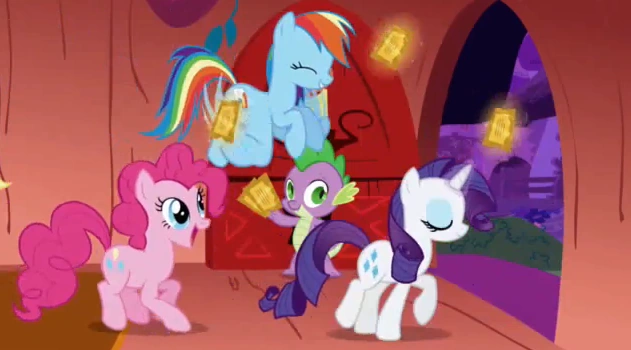図書館では5匹の友達がすでに待機していて、Twilightは誰も裏切りたくないと言い、その場に崩れてしまう。 Rainbow Dashを除く4匹の友人は、それぞれがチケット欲しさにTwilightに大きな苦痛を与えていた事を理解して謝る。Rainbow Dashはそれを見てチケットを獲得した事を喜ぶが、他のポニー達からの視線を感じとり、結局チケットを諦める。