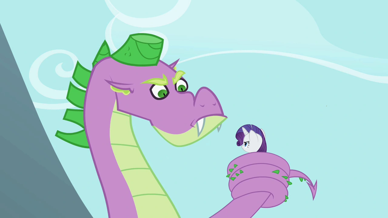 트와일라잇은 포니빌에서 스파이크를 발견하고, 빗자루를 이용해 스파이크를 도서관으로 유인한다. 트와일라잇은 스파이크를 도서관의 방에 가둬두지만, 스파이크는 벽을 부수고 도망쳐 버린다. 스파이크는 애플잭의 사과 나무, 플러터샤이의 닭장, 핑키파이의 케이크들을 훔치고, 래리티를 납치한다. 스파이크는 마을로 나와 난동을 부리고, 포니빌 근처의 산으로 올라간다. 레인보우 대시와 플러터샤이, 원더볼트는 래리티를 구하려 하지만, 모두 실패한다. 그 과정에서 래리티의 옷이 찢어지고, 래리티는 찢어진 옷을 벗어서 스파이크에게 보여주며 불평한다. 그러면서 래리티가 끼고 있던 스파이크가 준 보석으로 만든 목걸이가 드러나고, 스파이크는 자신의 과거를 회상한다. 스파이크는 그로 인해 다시 원래대로 돌아오고, 둘은 아래로 추락한다.