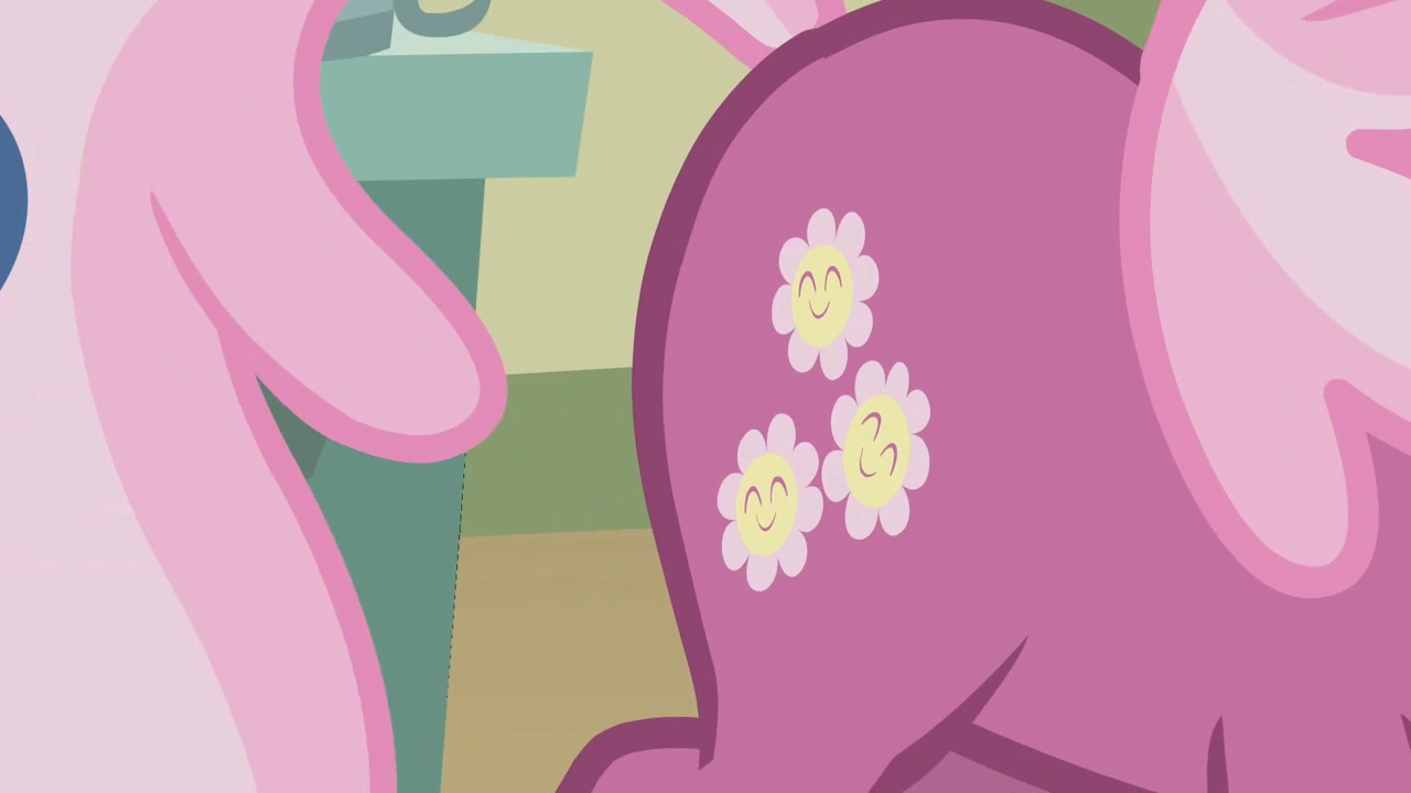 애플블룸이 큐티 파티가 슈가 큐브 코너에서 열린다는 것을 깨달았을 때는 이미 큐티 파티가 시작하고 난 이후였다. 애플블룸은 다른 포니들의 눈을 피해 슈가 큐브 코너에서 나가려고 하지만 애플잭과 만나 실패한다. 애플블룸은 식탁보로 옷을 만들어 엉덩이를 가리고 다이아몬드 티아라와 실버 스푼과 만난다. 애플블룸은 다시 슈가 큐브 코너에서 나오려고 하지만 옷에 발이 걸려 넘어지면서 모두의 주목을 받는다.