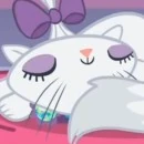 opal går altid med smaragd hals bånd lilla sløyfe og øyenskygge hun er helt vit bortsett fra hale tippen og en oransj snute