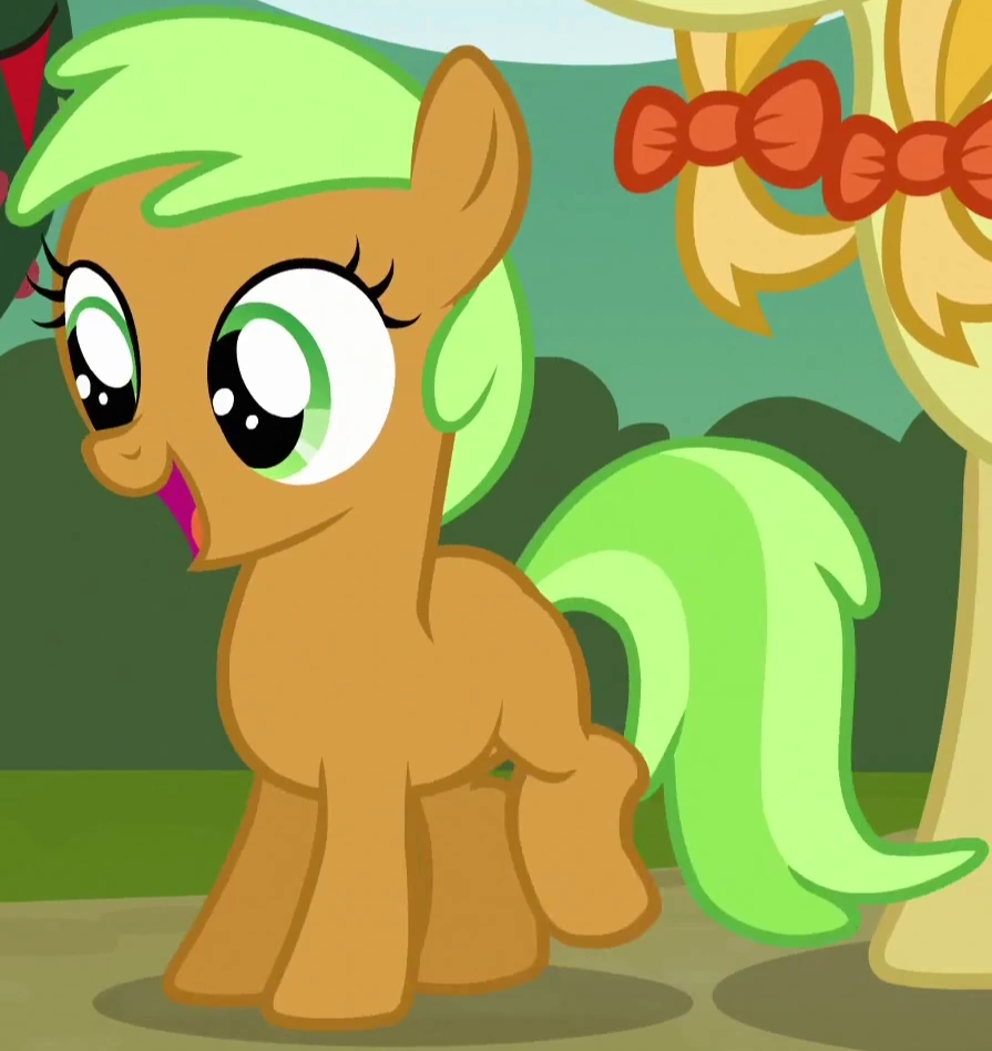 Apple Crumble ma cynamonową sierść, grzywę w dwóch odcieniach zielonego oraz oczy tego samego koloru. Nie ma jeszcze swego znaczka. Dzieli swój design z Tornado Bolt, Cotton Cloudy i Alulą.