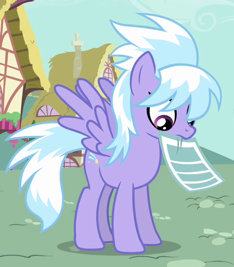 Jej debiut następuje w odcinku Huraganowa Fluttershy, kiedy rozmawia z Flitter, gdy nagle Rainbow Dash zwołuje zebranie wszystkich pegazów z Ponyville rozsypując na ziemię ulotki. Podczas zebrania Cloudchaser oraz Flitter stoją obok Fluttershy. Jest widoczna jeszcze parę razy na treningach, które miały na celu przygotować pegazy do wykonania tornada, które miało w głównym celu dostarczyć wodę potrzebną Cloudsdale, lecz też aby pobić rekord 910 skrzydło bić, ustanowiony przez Fillydelphię i dobić do 1000 skrzydło bić. Gdy Twilight prezentuje jej i Flitter wiatromierz, nie rozumie do czego służy. Jednorożec próbuje wytłumaczyć im jak to działa, lecz klacze nie rozumieją naukowego języka Twilight. Kiedy pytają Spike'a jak działa urządzenie, a smok odpowiada im, że ma na celu mierzyć siłę ich skrzydeł. Dopiero wtedy klacze załapują o co chodzi. Była widoczna również, gdy czochrała grzywę Thunderlane'a, ponieważ był pierwszym ochotnikiem do przetestowania maszyny Twilight. Podczas przemowy Rainbow, która chce, by każdy pegaz osiągnął moc skrzydeł równą 10, stoi podekscytowana wraz z Flitter, a potem wzlatują w górę i się ściskają. W czasie testu Fluttershy, zaczyna się śmiać wraz z Flitter, a nieśmiały pegaz odbiera to jako naśmiewanie się z niej. Jest widoczna podczas zbiórki przed tornadem. Gdy Fluttershy dołącza do niego i przypomina sobie, jak naśmiewano się z niej kiedyś, obok widać jej twarz. Po udanym transporcie wody do Cloudsdale, Cloudchaser wraz z Flitter gratulują Fluttershy wyniku.