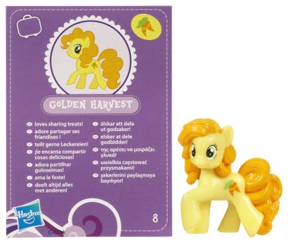 W styczniu 2012 roku w serii Mystery Packs pojawiła się figurka kucyka o imieniu Golden Harvest o designie Pinkie Pie, która miała paletę kolorów identyczną jak ta z serialu. Miała jednak dwie marchewki jako znaczek, a nie trzy. Europejska karta kolekcjonerska zawiera opis "lubi dzielić się przysmakami!", jednak amerykańska wersja zawiera jego wydłużoną wersję: "Golden Harvest lubi dzielić się przysmakami ze swojego ogrodu!"