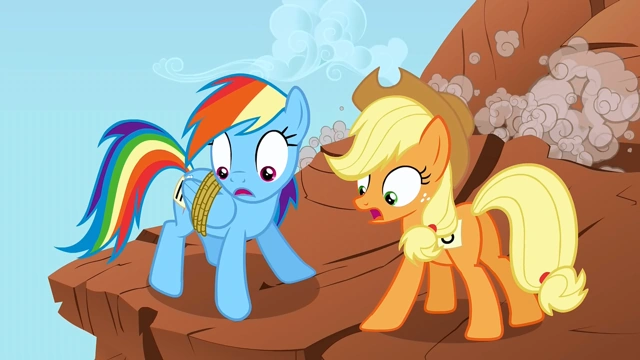 odpowiada, że to Dash zaczęła. Błękitny kucyk postanawia to zakończyć i wyprzedza farmerkę. Powierniczka uczciwości nie chce na to pozwolić i łapie Rainbow za ogon. Teraz to Applejack jest na początku, ale pegaz robi to samo: też cięgnie przeciwniczkę za ogon i krzyczy, że da radę wygrać. Pomarańczowy kucyk chce znów złapać ogon Rainbow, ale przez pomyłkę łapie linę wiążącą skrzydła pegazicy. Ta z radością woła: