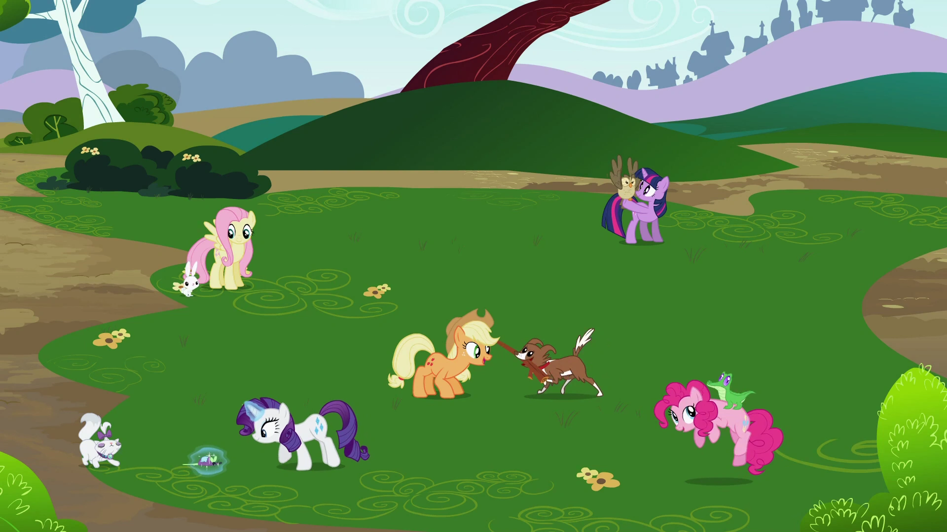 Rainbow budzi się na gałęzi, a obok niej Opal prycha i grozi pazurami zwierzętom u podnóża drzewa. Po chwili przybywa pięć przyjaciółek, które bawią się ze się ze swoimi pupilami. Rarity przeprasza RD za zachowanie Opal.