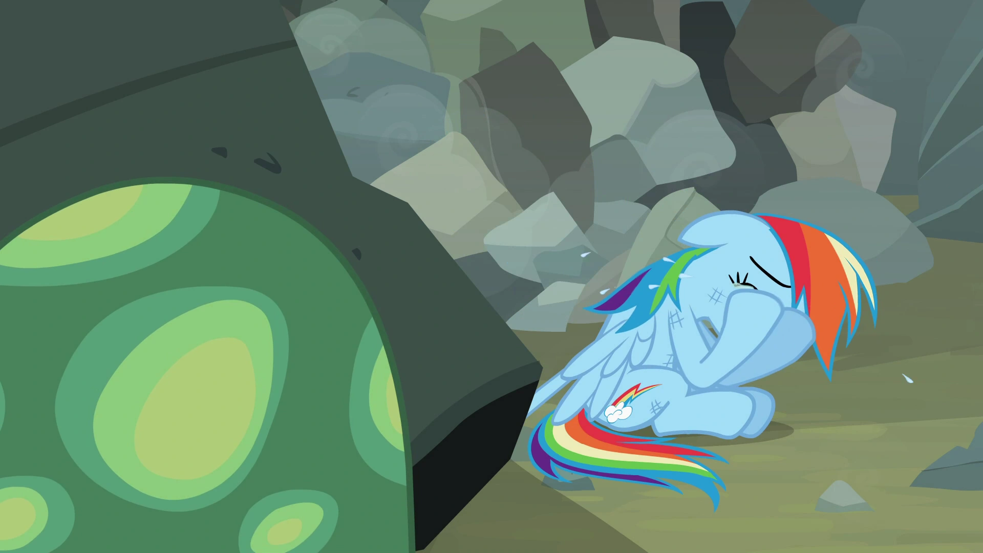 Rainbow jest bardzo smutna i już łzy zaczynają ciec z jej oczu, gdy nagle nadciąga pomoc. Okazuje się, że jest to... żółw lądowy. Wywołuje to falę złości RD, lecz żółw nie przejmuje się tym i zaczyna kopać pod głazem. Tęczowy pegaz stwierdza, że to już koniec i zaczyna naprawdę płakać, ale żółw podnosi kamień, uwalniając przy tym Rainbow...