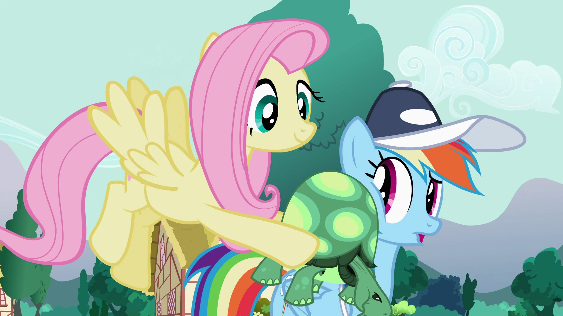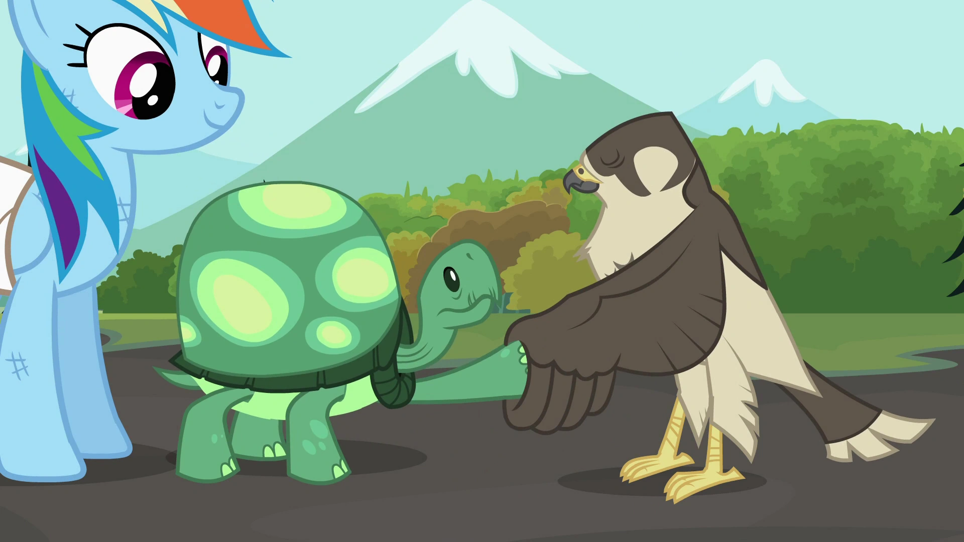 Na mecie przyjaciółki wraz ze swoimi zwierzakami czekają na zakończenie wyścigu. Jako pierwszy linię mety przekracza sokół, potem orzeł, następnie nietoperz, a na końcu sowa, lecz nie ma Rainbow, co bardzo dziwi kucyki. Twilight stwierdza, że coś jest nie w porządku, więc zaczyna obserwować przez lornetkę trasę wyścigu, lecz po chwili jej przyrząd optyczny przejmuje zaniepokojona Fluttershy, a następnie Applejack, która zauważa, że zeszła lawina kamieni. Kucyki i Spike zaczynają się obawiać o los Rainbow, gdy Pinkie zauważa żółwia. Trzy przyjaciółki zwracają jej uwagę, że to żółw lądowy, ale tym razem Fluttershy już nie zwraca uwagi na prawidłowe określenie zoologiczne. Pinkie Pie zauważa też, że zwierzak niesie na swojej skorupie ranną RD z bandażem na skrzydle. Fluttershy proponuje, aby wyjść na spotkanie dzielnego gada i przybliżyć mu linię mety, co robi Twilight swoją magią. Spike chwali żółwia, a Rarity, swoim zwyczajem, zwraca uwagę na brud na ciele Rainbow. Tęczowy pegaz chwali żółwia, a Fluttershy przedstawia przyjaciółce jej nowego pupila - sokoła. Ptak doskonale pasuje do pegaza, lecz RD nie jest zachwycona. Fluttershy stwierdza, że to świetny zwierzak i proponuje nawet zaśpiewanie piosenki, a Rarity robi zdjęcie, przy czym lampa błyskowa ponownie powoduje, że żółw chowa się w skorupę. Rainbow go uspokaja i mówi, że sokół rzeczywiście wygląda dumnie i jest taki jak wcześniej chciała, ale[uwaga 5]: