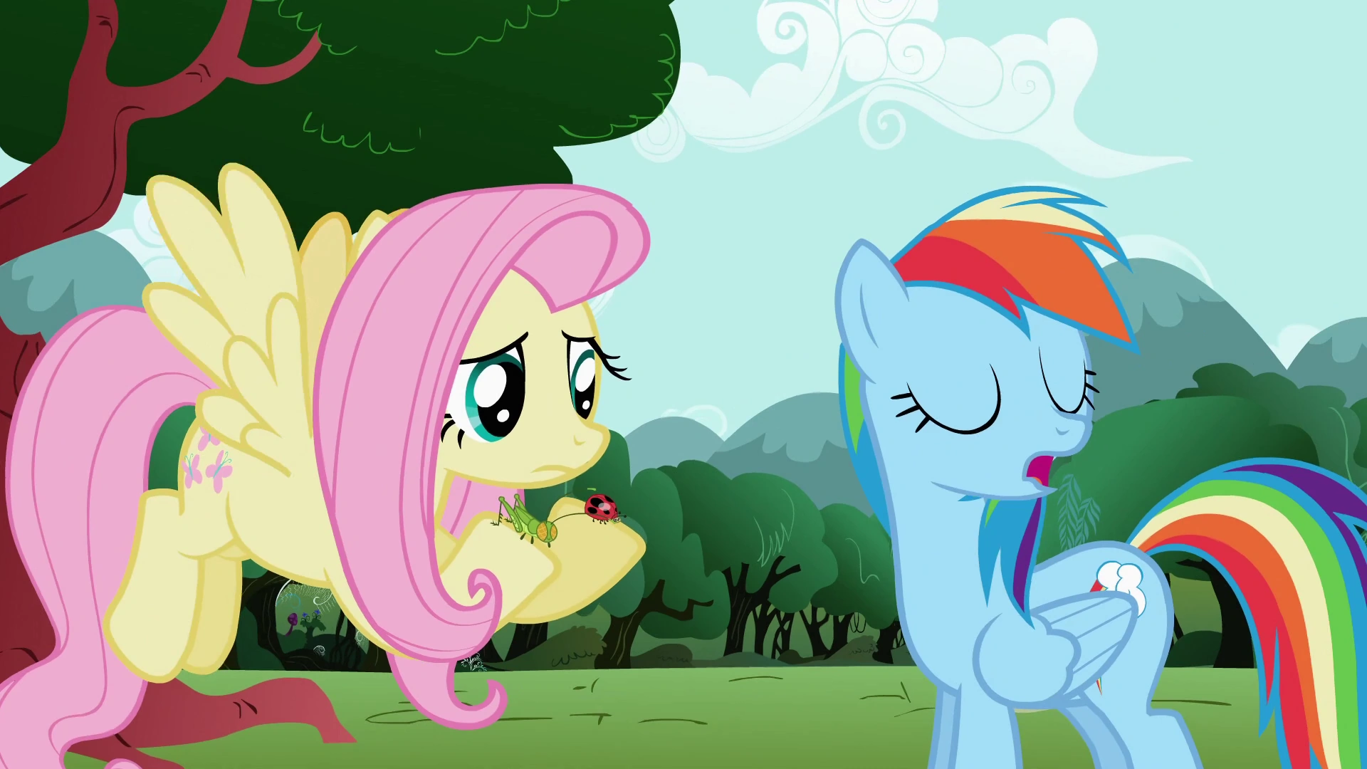 W chatce Fluttershy oba pegazy zaczynają śpiewać Find A Pet Song, w której Fluttershy przedstawia cały asortyment zwierząt. Rainbow na samym początku już stawia warunki: zwierzak musi być odlotowy i szybki jak błysk. Fluttershy proponuje jej ślicznego i miłego królika, jednak nie odpowiada on RD, która dodaje, że jej zwierzak musi też latać. Mimo to, Fluttershy pokazuje jej puszystego kotka, na co RD szybko odmawia przyjęcia takiego pupila. Fluttershy nie daje za wygraną i pokazuje fokę i wydrę, które nie latają, ale foka potrafi wyskoczyć dziesięć stóp w powietrze. Nie przekonuje to RD, która chce już odejść, lecz przyjaciółka zatrzymuje ją, pokazując biedronkę i świerszcza. Są one jednak za małe i niezbyt fajne z punktu widzenia wybrednego pegaza. Fluttershy postanawia wyciągnąć asa z rękawa i pokazuje przyjaciółce... wiewiórkę. Jednak nie jest to zwykła wiewiórka, gdyż potrafi latać. Atrakcyjna oferta nie budzi jednak zainteresowania RD, która mówi, że chce zwierzaka, który jest szybki, fajny, niezwykły i "śmiejący się z grawitacji". Fluttershy nareszcie przyjmuje do wiadomości, że jej przyjaciółka chce skrzydlatego pupila, więc pokazuje jej podniebne stworzenia. Na początek pokazuje jej kolibra i motyla królewskiego[uwaga 1], co zaczyna interesować Rainbow. Następnie Fluttershy prezentuje sowę, osę, tukana, orła, sokoła i nietoperza. Taka oferta odpowiada Rainbow Dash, lecz pojawia się inny problem - pegaz, który przed chwilą chciał już odejść, teraz nie jest w stanie wybrać pupila z szerokiego zbioru przedstawionego przez przyjaciółkę.