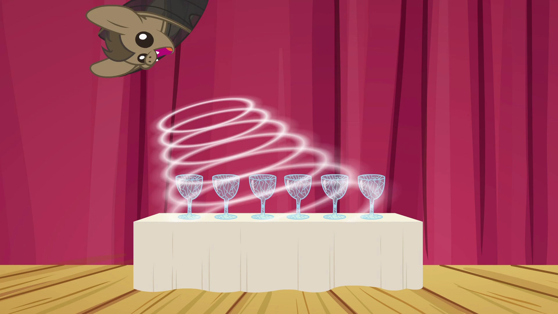 W tej konkurencji zawodnicy ponownie popisują się umiejętnościami. Kaczka stepuje w kapeluszu i z laseczką, co jednak nudzi Rainbow Dash. Orzeł robi na drutach sweterek z wizerunkiem wymarzonej właścicielki (Rainbow), ale to również nie budzi zachwytu tęczowego pegaza. Sokół próbuje czytać w myślach RD i odgadnąć jaką kartę ona trzyma, ale nie wychodzi mu. Osa demonstruje różne kształty cienia na tle światła rzucanego przez latarkę, co tak nudzi energicznego kucyka, że Rainbow zasypia. Nietoperz z kolei gra melodię[uwaga 3] pocierając skrzydłami obrzeża kieliszków, a następnie kruszy naczynia emitowanymi przez siebie dźwiękami. Budzi to zachwyt Rainbow, która jednak stwierdza, że było to niezwykłe, a to jest konkurs nadzwyczajności, więc odejmuje zwierzakowi kilka punktów. Na koniec żółw lądowy próbuje przebyć morderczy tor przeszkód z basenem z rekinami, gilotyną, pierścieniem ognia i innymi pułapkami, ale nie dociera nawet do pierwszej przeszkody, tylko się przewraca i zapada za nim kurtyna. Wyniki konkursu wyglądają zapewne tak: