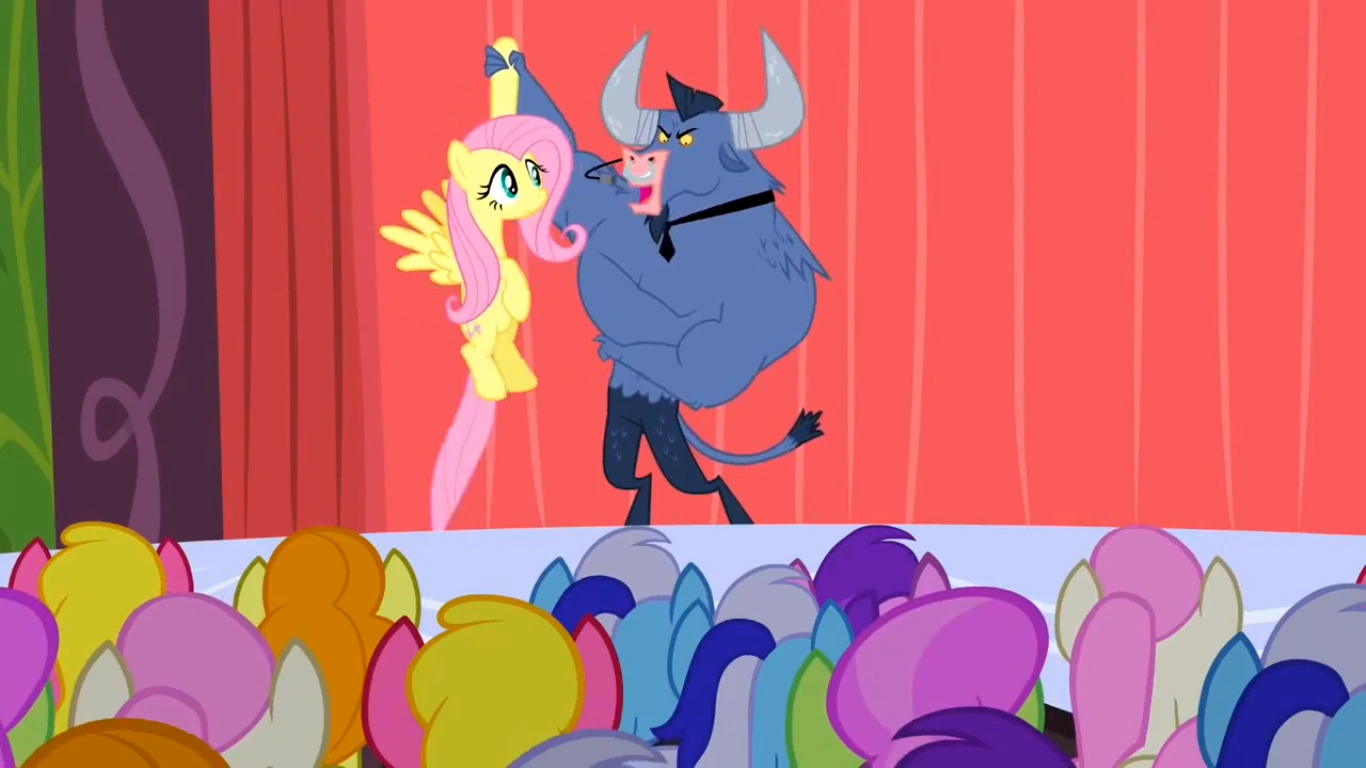 Fluttershy przechodzi niepewnie wokół kóz i innych kucyków. Ustawia się w pierwszym rzędzie, jednak kucyki ją wykopują na sam koniec. Wtedy z głośników zaczyna lecieć muzyka a na scenie w efektowny sposób pojawia się Minotaur. Przedstawia się jako Iron Will, posiadacz żelaznej woli. Minotaur nawołuje kuce do głośnego tupania, po czym wspomina, że jeśli nie będą w 100% zadowolone z jego usług, nie zapłacą nic. Następnie woła ochotnika. Prawie wszystkie kuce zgłaszają się, jednak Fluttershy kuli się za tłumem. Wtedy jednak koza ją znajduje i przekazuje to Ironowi. Minotaur woła ją więc na scenę. Kucyk idzie tam niechętnie, a na miejscu jedna koza blokuje jej drogę. Iron pyta ją, jak zamierza sobie z nim poradzić. Fluttershy wymienia kilka propozycji, jednak na każdą Iron odpowiada "nie", a na końcu wykrzykuje rymowankę: