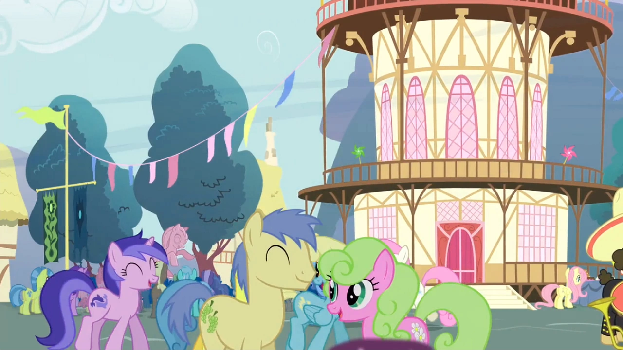 W tle widzimy Ponyville. Kucyki w mieście przygotowują się na ciepłe powitanie bryzusiów. Zorganizowana została orkiestra, w której grają ogiery z różnymi instrumentami m.in gitara basowa. Są też przeróżne stoiska z przekąskami, piękne ozdoby wiszące jak i stojące. Wiele kucyków także zebrało się pod ratuszem i z niecierpliwością czekają na bryzusie.