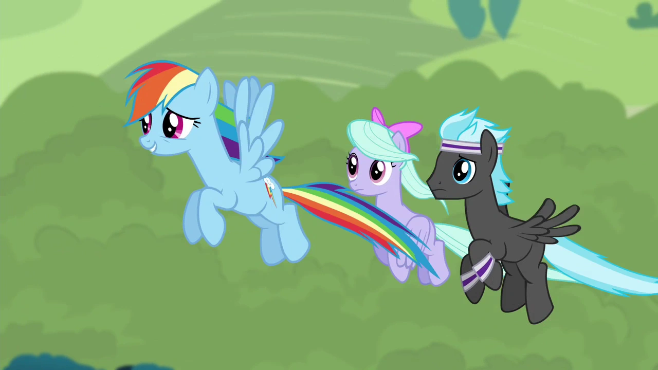 Rainbow Dash, znana ze swoich szybkich skrzydeł, pilnuje prędkości wiatru. Towarzyszy jej Flitter i Cloud Chaser, który ma na sobie przepaskę na grzywie. Rainbow krzyczy, że wiatr jest za duży. Jeśli nie zmniejszą zefiru, bryzusie zostaną rozerwane na strzępy. Flitter i Thunderlane nie protestują przeciw temu i zmniejszają prędkość wiatru używając swoich skrzydeł.
