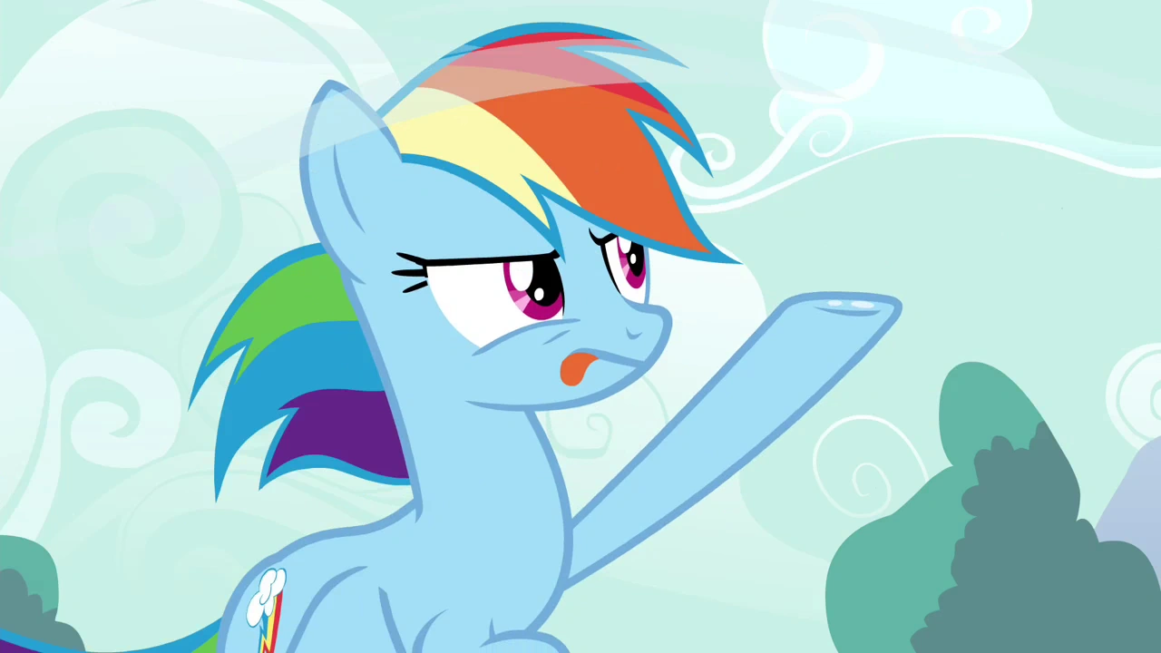 - Rainbow Dash: Na pewno? To może smokiem? Nie? Nie musi od razu zioniąć ogniem! [chichocze]