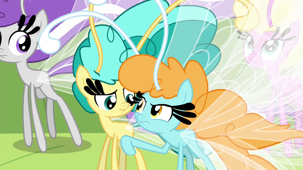 Nagle Applejack wyrastają czułka, Rarity piękne, prześwitujące skrzydła czułka, i... nogi jak patyki, a Pinkie Pie się kurczy, przy tym śmiejąc się. Całe mane 6 stało się bryzusiami. Fluttershy mówi do przyjaciółek: