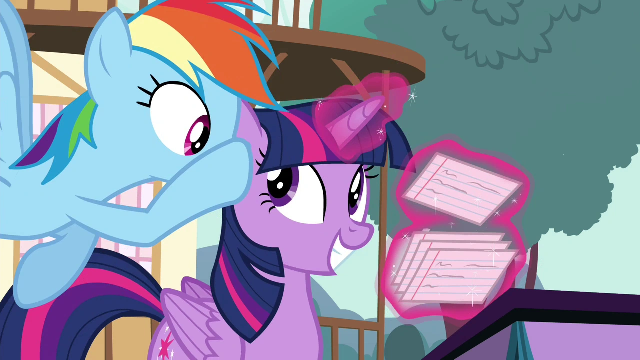 - Twilight Sparkle: Studiowałam księgę zaklęć, którą znalazłam w Zamku Dwóch Sióstr. Jest tam zaklęcie, które może nam pomóc. Podejrzewam, że to będzie dla nas trochę dziwne uczucie, ale musicie mi zaufać.