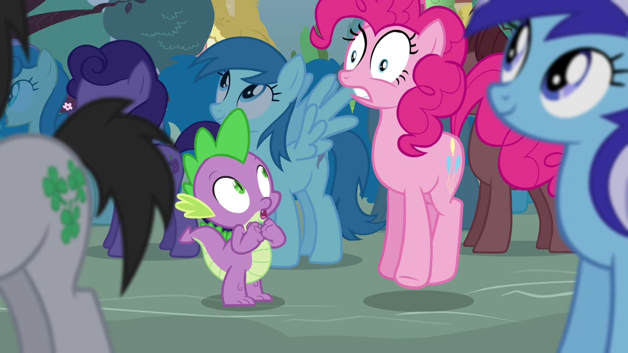 Spike trochę przeraził się zachowania Pinkie Pie i wycofał się. Wpadł akurat na drzewo. Szybko wspiął się na gałąź, ale zamiast usiąść blisko pnia, stanął na samym czubku gałęzi, a co gorsza... zaczął podskakiwać. Listek, który był na gałęzi urwał się.