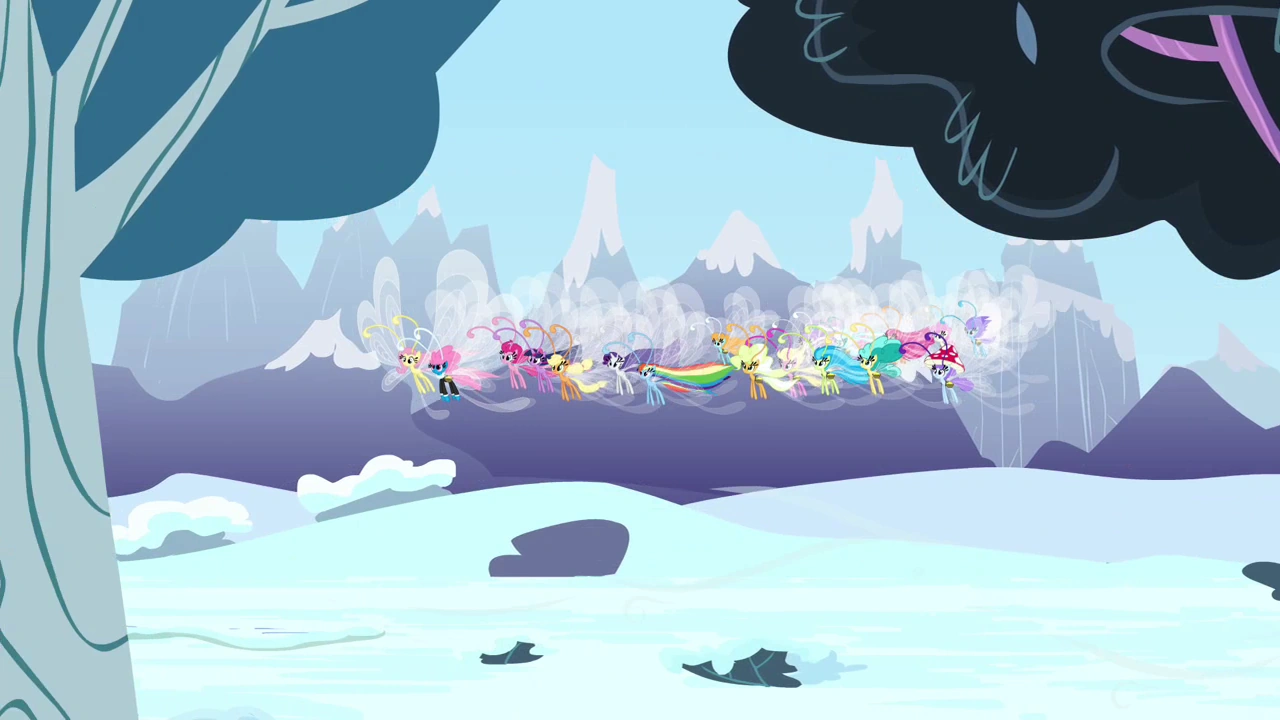 Wszyscy wlatują, a mane 6 jest wręcz zachwycona. Kraina bryzusiów okazuje się pięknym miejscem, z mnóstwem kwiatów i wodospadów, sporo jest też domków, nie wspominając o samych bryzusiach, które gdzie nie spojrzeć latają wszędzie. Dashie komentuje to trzema zdaniami:
