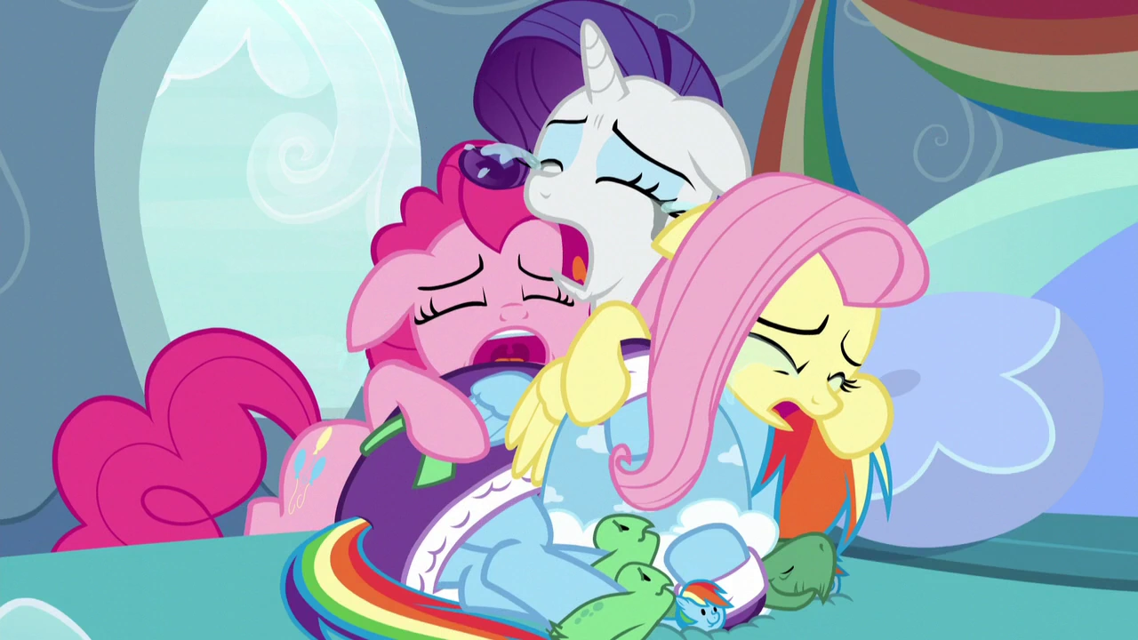 póki nie da upustu swoim emocjom. Rainbow nadal lała rzewnie łzy. Twilight magią pociągnęła Applejack w stronę płaczącej pegazki i dała jej znak, aby coś zrobiła. Applejack spróbowała pocieszyć Dashie mówiąc, iż Tank powróci za kilka miesięcy. Pegaz mówi, że nie chce, by jej żółw odchodził i dalej płacze. Applejack się pyta Fluttershy jak sprawić, by Rainbow przestała płakać. Jasnożółta pegazka odpowiedziała, że powinna już kończyć, po czym podchodzi do Rainbow Dash i pyta się jej czy lepiej się czuje. Rainbow już chce odpowiedzieć, ale nie mogąc powstrzymać swoich emocji ponownie wybuchła płaczem. Fluttershy także zaczyna płakać, a Pinkie i Rarity mówią, iż nie mogą znieść widoku płaczącej Fluttershy i dołączają do "płaczącej ekipy". Twilight pyta się Applejack czy ma zamiar płakać. Odpowiada, że nie. Twilight oznajmia płaczącym przyjaciółkom,