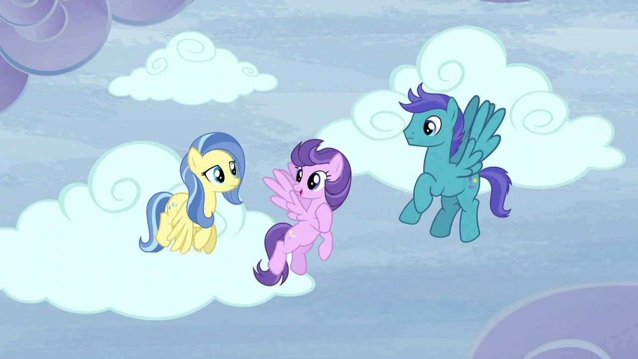 Jeden z pegazów pyta drugiego, gdzie idą chmury. Odpowiada jej, że tam gdzie Clear Skies. Pegazica nie rozumie to jako imię, tylko jak pogodne niebo[1]. Mówi, że pogodne niebo jest wszędzie. Wtedy przylatuje Clear Skies, mówiąc, że jest tutaj. Odpowiada, że wszędzie jest pogodne niebo. Clear Skies przedstawia Open Skies. Klacz znowu rozumie nie jako imię, tylko rozległe niebo[2] i mówi, że rozległe niebo jest wszędzie. Open Skies odpowiada, że nie jest wszędzie, jest tutaj. W końcu rozumie, że to są imiona. W tym czasie Rainbow Dash zabiera chmury. Open Skies pyta się, gdzie podziały się te puszyste chmury. Clear Skies rozumie to jako imię i wskazuje Fluffy Clouds[3]. Na ziemi Rainbow Dash chowa chmurę pod drzewem, mówiąc do Tanka, że powstrzymanie zimy łatwo jej pójdzie. Kiedy odlatuje z Tankiem, ta chmura spada na ogiera, zamieniając się w śnieg. Dashie zaczyna śpiewać piosenkę, próbując powstrzymać zimę. Rozbija lód w kałużach, chowa narty pod ziemią, kieruje ptaki na północ, zamiast na południe, oczyszcza niebo z chmur, daje liście na drzewa, zmienia otoczenie w bardziej wiosenne, Tank znowu ziewa. Rainbow widzi pegazy z chmurami i ziemskie kucyki, które zamiatają jesienne liście. Niebieski pegaz mówi Tankowi: