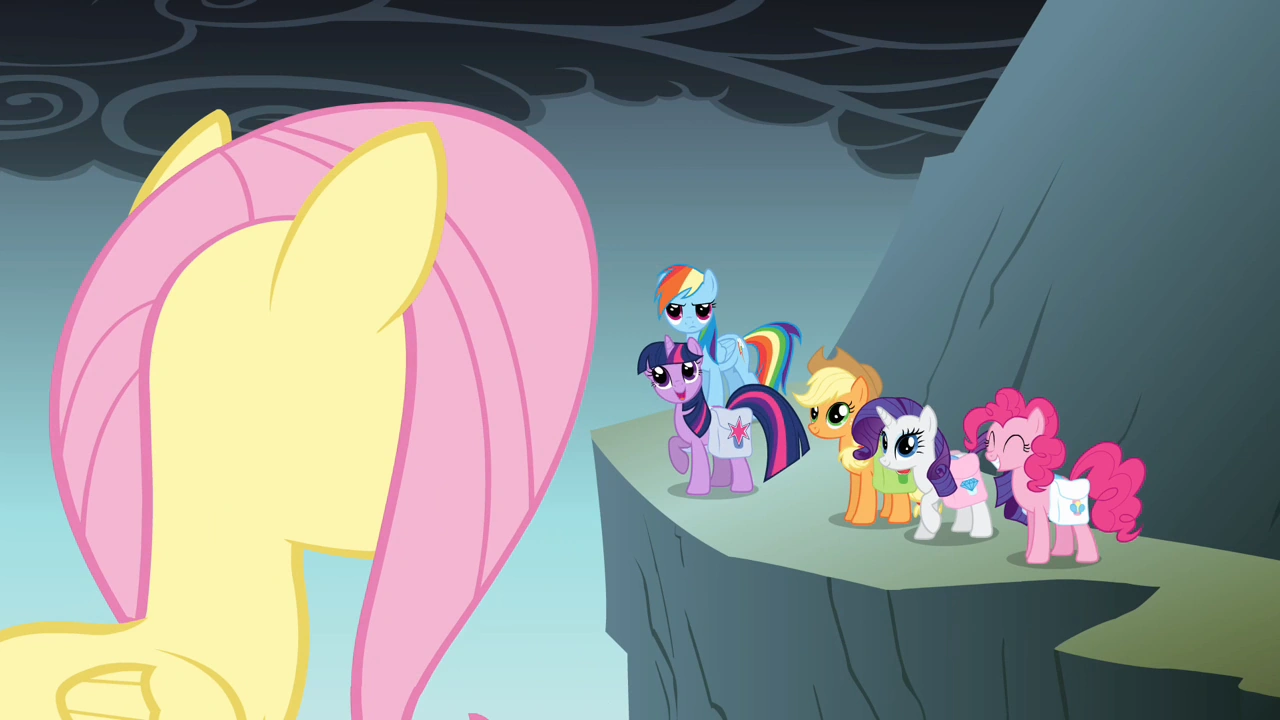 Po chwili skryta za Applejack Fluttershy, oznajmia, że jest to bardzo wysoko. Nagle Rainbow Dash z poirytowaniem wyjaśnia jej, że w końcu jest to góra, więc musi być wysoka. Następnie pegaz oznajmia, iż poleci tam i wszystko sprawdzi. Jednak zatrzymuje ją Applejack, która łapiąc zębami za jej ogon, ściąga ją do niżu. Kiedy pegaz opanowuje swoją werwę, kucyk każe jej zaczekać, po czym tłumaczy, iż uważa, że lepszym pomysłem będzie, jak wejdą tam razem. Reszta przyjaciółek popiera zdanie Applejack. Rainbow Dash widząc jednogłośny głos w trzymaniu się razem, niechętnie zgadza się na to.