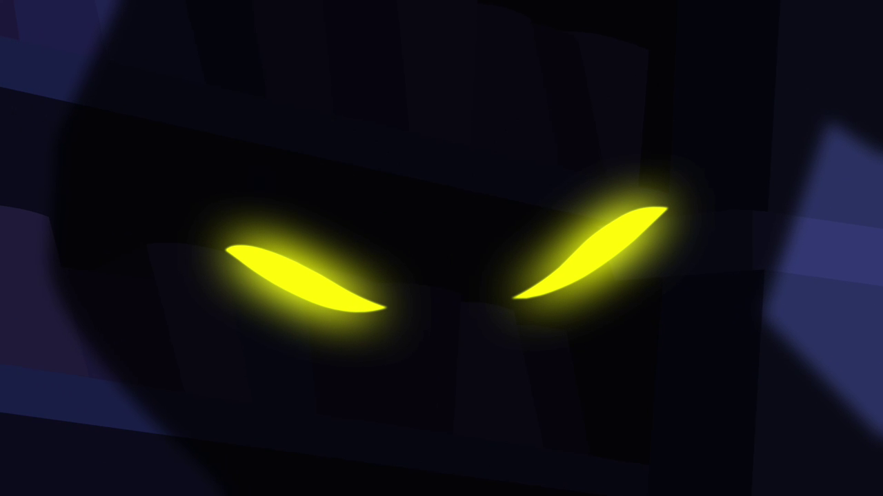 Когда Спайк опровергает идею о пони теней, в ближней комнате на полки отбрасывает тень тёмная фигура с сияющими жёлтыми глазами.