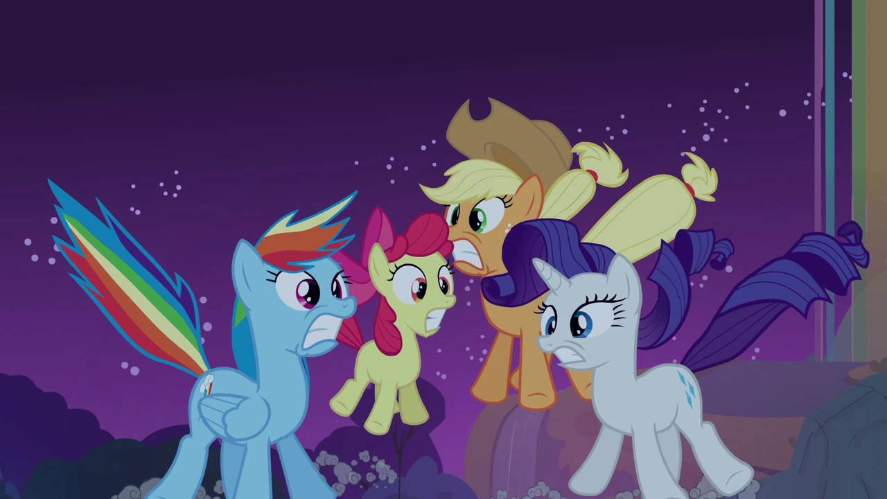 Радуга спасает её, когда та падает через водопад, и спрашивает, почему та была за пределами пещеры. Приободрённая силуэтом Принцессы Луны на луне, Скуталу признаёт собственную напуганность и рассказывает, почему она притворялась отважной. По правде сказать, Радуга признаётся, что тоже испугалась, когда впервые услышала эти страшилки. Она обещает взять Скуталу под своё крыло, и пара обнимается. На следующий день пони наконец добираются до Чарующих каскадов — огромных водопадов с радужной водой. Когда другие пони начинают гонку, Радуга со Скуталу летят за ними вместе.
