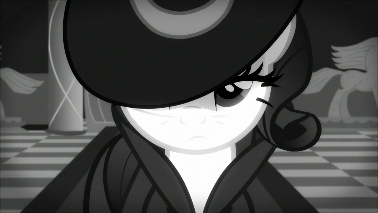 В чёрно-белой пародии на фильмы нуар 1940-ых годов Рарити и Радуга расследуют дворцовые покои Спитфайр. Рарити обнаруживает пучок гривы Радуги на конверте, в котором, собственно, и было прислано письмо, а ещё обнаруживает, что одна из занавесок в коридоре отсутствует.