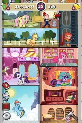 Додаток від Electronic Arts "Monopoly Hotels" Hasbro на iOS включає декілька гостьових кімнат My Little Pony: кімнату «Солодке яблуко», що належить Еплджек; кімнату Хмародейла, яка належить Рейнбоу Деш; «Сахарний куточок» Пінкі Пай; Бутик Карусель Реріті; «Золотий дуб», що належить Твайлайт Спаркл; кімнату Будинку Флаттершай;[1] кімнату «Драконяче дихання» Спайка та незакінчену кімнату, що належить Принцесі Селестії, яку ще потрібно додати.