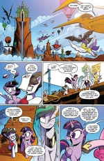 In My Little Pony: Friendship is Magic Issue #61, Twilight, Raven Inkwell, Celestia, and Cadance ride an airship to Mount Metazoa.
